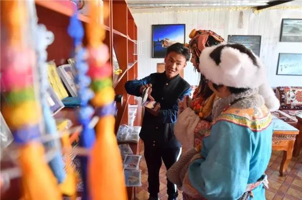 西藏自治區(qū)納木錯自然保護區(qū)郵局,旦增洛珠(左)正在給游客介紹旅游產(chǎn)品。自農(nóng)村電商工作開展以來,西藏郵政已在全區(qū)各地(市)多個郵政營業(yè)網(wǎng)點、便民服務(wù)站、小商超店、旅游景點等地建立“郵掌柜”、郵樂購、郵樂網(wǎng)、天上西藏E郵等網(wǎng)上購物和銷售系統(tǒng)。