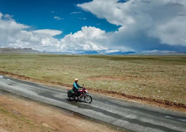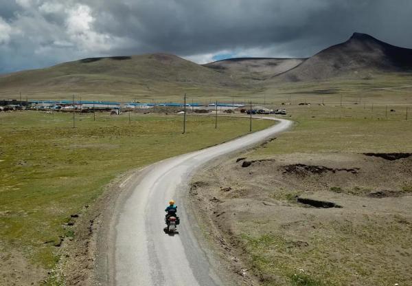 格桑次仁騎摩托車投遞郵件,經過長途跋涉后海拔5500米的沙空村出現在前方(7月27日攝)