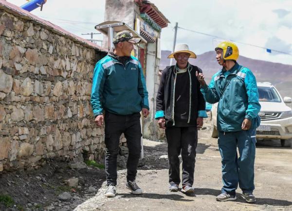 次仁曲巴(左一)和格桑次仁(右一)在普瑪江塘鄉(xiāng)沙空村投遞郵件時和當地村民聊天(7月27日攝)