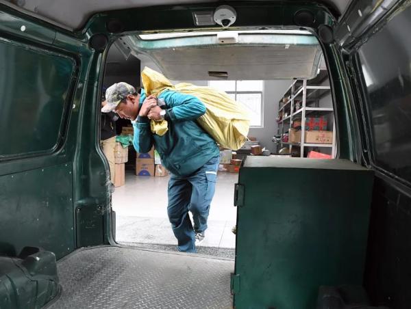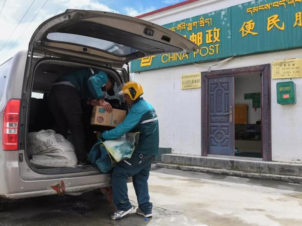 投遞員次仁曲巴向郵車內搬運需要投遞的包裹(7月23日攝)