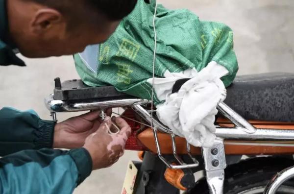 為了防止道路顛簸損壞郵包,投遞員格桑次仁將郵包牢固地捆扎在摩托車的尾部(7月23日攝)