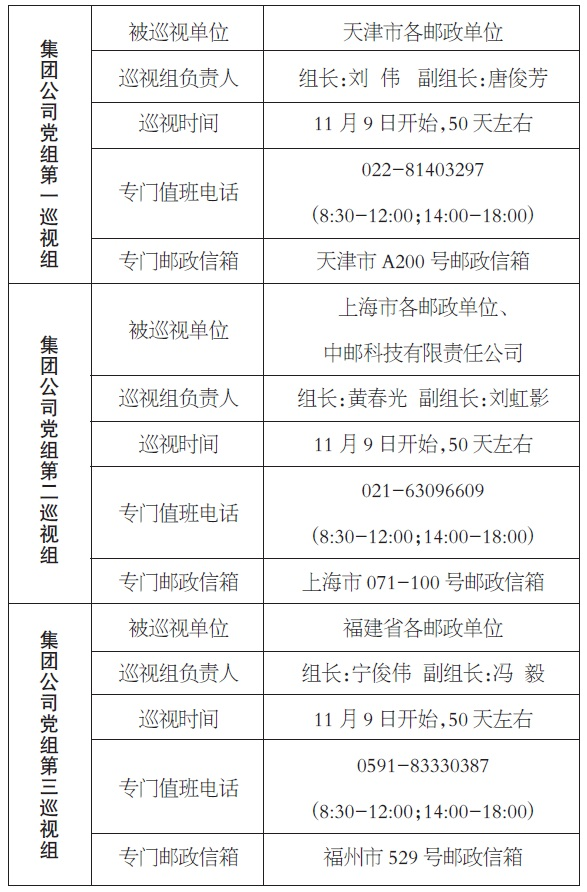 集團公司黨組首批巡視對集團公司天津市、上海市、福建省分公司,郵政儲蓄銀行天津、上海、福建省、廈門分行,中郵人壽保險公司天津、上海分公司,中郵證券公司上海、福建分公司,中郵科技有限責任公司等12個單位的黨委(黨組)領(lǐng)導(dǎo)班子及其成員開展常規(guī)巡視。
