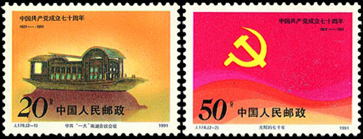 1921年7月召開(kāi)的中國(guó)共產(chǎn)黨第一次全國(guó)代表大會(huì)正式宣告了中國(guó)共產(chǎn)黨的誕生,第一枚郵票展現(xiàn)了會(huì)址之一——浙江嘉興南湖紅船。該套郵票由雷漢林設(shè)計(jì),于1991年7月1日發(fā)行。