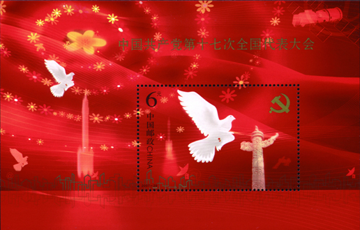 中國(guó)共產(chǎn)黨第十七次全國(guó)代表大會(huì)于2007年10月15日至21日在北京召開(kāi)。大會(huì)主題是:高舉中國(guó)特色社會(huì)主義偉大旗幟,以鄧小平理論和“三個(gè)代表”重要思想為指導(dǎo),深入貫徹落實(shí)科學(xué)發(fā)展觀(guān),繼續(xù)解放思想,堅(jiān)持改革開(kāi)放,推動(dòng)科學(xué)發(fā)展,促進(jìn)社會(huì)和諧,為奪取全面建設(shè)小康社會(huì)新勝利而奮斗。該套郵票由陳幼林、王戈設(shè)計(jì),于2007年10月15日發(fā)行。