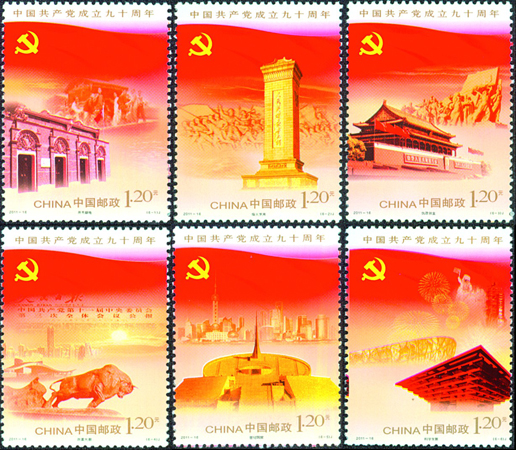 為慶祝中國(guó)共產(chǎn)黨成立九十周年,2011年7月1日,中國(guó)郵政發(fā)行《中國(guó)共產(chǎn)黨成立九十周年》紀(jì)念郵票一套6枚,分別表現(xiàn)了中國(guó)共產(chǎn)黨在九十年間所經(jīng)歷的6個(gè)重要階段:開(kāi)天辟地、烽火歲月、執(zhí)政創(chuàng)業(yè)、改革大潮、世紀(jì)跨越、科學(xué)發(fā)展。該套郵票由郝旭東設(shè)計(jì)。