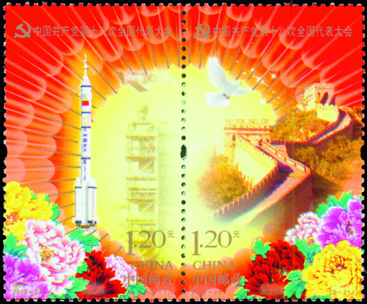 中國(guó)共產(chǎn)黨第十八次全國(guó)代表大會(huì)于2012年11月8日在北京人民大會(huì)堂召開(kāi)。此次大會(huì)是我們黨在全面建設(shè)小康社會(huì)的關(guān)鍵時(shí)期和深化改革開(kāi)放、加快轉(zhuǎn)變經(jīng)濟(jì)發(fā)展方式的攻堅(jiān)時(shí)期召開(kāi)的一次十分重要的會(huì)議,是全黨全國(guó)各族人民政治生活中的一件大事,對(duì)我們黨高舉中國(guó)特色社會(huì)主義偉大旗幟,團(tuán)結(jié)帶領(lǐng)全國(guó)各族人民繼續(xù)全面建設(shè)小康社會(huì)、堅(jiān)持科學(xué)發(fā)展、加快推進(jìn)社會(huì)主義現(xiàn)代化、開(kāi)創(chuàng)中國(guó)特色社會(huì)主義事業(yè)新局面具有重大而深遠(yuǎn)的意義。黨的十八大代表名額共計(jì)2270名,這些代表由全國(guó)40個(gè)選舉單位選舉產(chǎn)生。黨的十八大選舉出了新一屆的中共中央領(lǐng)導(dǎo)層。為紀(jì)念中國(guó)共產(chǎn)黨第十八次全國(guó)代表大會(huì)的召開(kāi),中國(guó)郵政發(fā)行紀(jì)念郵票一套2枚,小型張1枚。該套郵票由許開(kāi)強(qiáng)、饒鑒設(shè)計(jì),小型張由郝旭東設(shè)計(jì),于2012年11月8日發(fā)行。