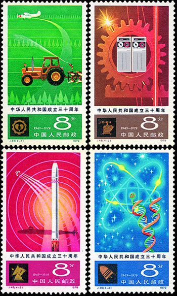 這套郵票屬于第五組中華人民共和國(guó)成立30周年紀(jì)念郵票,一套4枚,分別從農(nóng)業(yè)、工業(yè)以及國(guó)防現(xiàn)代化和科技技術(shù)現(xiàn)代化事業(yè)方面展現(xiàn)了我國(guó)建國(guó)30周年的發(fā)展?fàn)顩r。該套郵票由薛世哲設(shè)計(jì),于1979年10月1日發(fā)行。