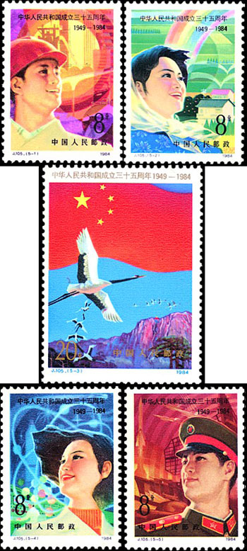 為慶祝中華人民共和國(guó)成立35周年,發(fā)行紀(jì)念郵票一套5枚,圖案分別為:壯麗的圖景、希望的田野、光輝的前程、科學(xué)的春天、保衛(wèi)你!祖國(guó)。該套郵票由陳曉聰設(shè)計(jì),于1984年10月1日發(fā)行。