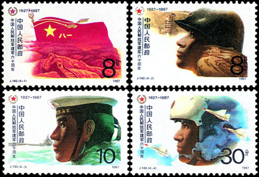 1987年8月1日,在中國(guó)人民解放軍建軍60周年之際,郵電部發(fā)行了這套以三軍士兵形象為圖案的紀(jì)念郵票,全套4枚。內(nèi)容分別為:“軍魂”畫(huà)面為在長(zhǎng)城和高山的村托下,高高飄揚(yáng)的中國(guó)人民解放軍“八一”軍旗。“陸軍戰(zhàn)士”主圖是陸軍戰(zhàn)士頭像,背景為祖國(guó)的錦繡河山及導(dǎo)彈發(fā)射基地。“海軍戰(zhàn)士”主圖是海軍戰(zhàn)士頭像,背景為浮出水面的潛水艇。“空軍戰(zhàn)士”主圖是空軍戰(zhàn)士頭像,背景為新型戰(zhàn)斗機(jī)。每枚郵票的左上角都有中國(guó)人民解放軍“八一”軍徽。該套郵票由劉向平設(shè)計(jì)。
