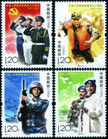 2007年8月1日發(fā)行《中國(guó)人民解放軍建軍八十周年》紀(jì)念郵票一套4枚,生動(dòng)表現(xiàn)了中國(guó)人民解放軍在黨的領(lǐng)導(dǎo)下,參加抗洪搶險(xiǎn)、進(jìn)行軍事訓(xùn)練以及參與聯(lián)合國(guó)維和行動(dòng)的英姿,集中反映了軍隊(duì)建設(shè)的發(fā)展成就、優(yōu)良傳統(tǒng)和我軍忠實(shí)履行歷史使命的時(shí)代風(fēng)采。該套郵票由李翔、張樹(shù)軍、張衛(wèi)奇、劉偉設(shè)計(jì)。