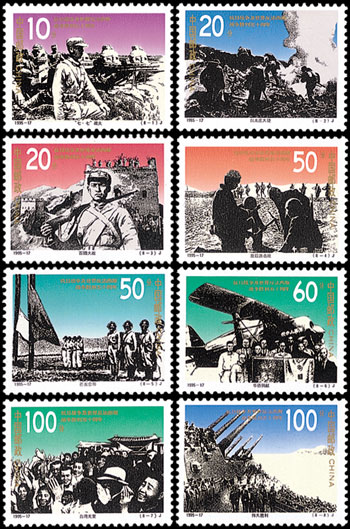 1995年9月3日,中國(guó)郵政發(fā)行了《抗日戰(zhàn)爭(zhēng)暨世界反法西斯戰(zhàn)爭(zhēng)勝利五十周年》紀(jì)念郵票,一套8枚。該套郵票的設(shè)計(jì)比較有特色,將8幅照片經(jīng)過(guò)處理,形成類(lèi)似于版畫(huà)的效果躍然紙上,背景采用了不同的顏色。這8枚郵票反映了抗日戰(zhàn)爭(zhēng)中的八大事件,包括:七七事變、臺(tái)兒莊大捷、百團(tuán)大戰(zhàn)、敵后游擊隊(duì)、芒友會(huì)師、華僑捐獻(xiàn)、臺(tái)灣光復(fù)、偉大勝利。該套郵票由何潔、陳楠、馮小紅設(shè)計(jì)。