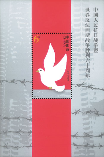 2005年8月15日,中國(guó)郵政發(fā)行《中國(guó)人民抗日戰(zhàn)爭(zhēng)暨世界反法西斯戰(zhàn)爭(zhēng)勝利六十周年》紀(jì)念郵票,一套4枚,小型張1枚,這也是第一枚抗戰(zhàn)勝利小型張。郵票內(nèi)容上第一次出現(xiàn)中國(guó)以外反法西斯的戰(zhàn)場(chǎng),第三枚為諾曼底登陸,第四枚為攻克柏林。小型張為和平與正義,主圖是和平鴿,背景是戰(zhàn)爭(zhēng)中坦克的印記以及集中營(yíng)的鐵網(wǎng)。該套郵票由武將設(shè)計(jì)。