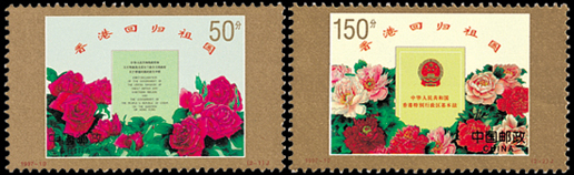 1997年7月1日,香港回到了久離的祖國(guó)母親的懷抱。為了紀(jì)念這一歷史時(shí)刻,郵電部發(fā)行了《香港回歸祖國(guó)》郵票一套2枚,小型張1枚。這套郵票的畫(huà)面設(shè)計(jì)以歷史性文件為中心,下部飾以環(huán)繞的花卉。第一枚郵票面值為50分,表現(xiàn)的是中英兩國(guó)政府簽署的《中英聯(lián)合聲明》。該聲明確定中國(guó)將恢復(fù)對(duì)香港行使主權(quán),反映了新中國(guó)外交工作的巨大成就。聲明下部圍繞著原產(chǎn)于中國(guó)、為英國(guó)人所喜愛(ài)的、象征和平、表示慶賀的月季花,寓意中英兩國(guó)通過(guò)談判圓滿(mǎn)解決了歷史遺留的問(wèn)題,回歸后的香港更加和平幸福。第二枚郵票面值為150分,表現(xiàn)的是七屆全國(guó)人大三次會(huì)議通過(guò)并頒布的《中華人民共和國(guó)香港特別行政區(qū)基本法》。該套郵票由任宇、王虎鳴設(shè)計(jì),于1997年7月1日發(fā)行。