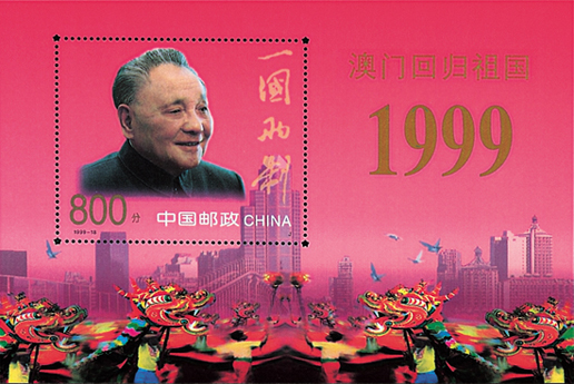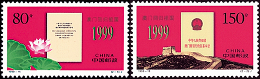 1999年12月20日,為了紀(jì)念澳門(mén)回歸祖國(guó),國(guó)家郵政局發(fā)行了《澳門(mén)回歸祖國(guó)》紀(jì)念郵票一套2枚。郵票第一枚為“中葡聯(lián)合聲明”,畫(huà)面以《中葡聯(lián)合聲明》為中心,左下角飾以荷花襯托。第二枚為“澳門(mén)基本法”,畫(huà)面以《澳門(mén)基本法》為中心,下部飾以長(zhǎng)城圖案。該套郵票由楊文清、張桂林設(shè)計(jì),于1999年12月20日發(fā)行。