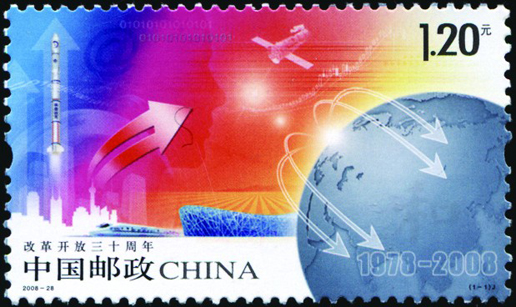 2008年12月18日,為紀(jì)念改革開(kāi)放30周年,國(guó)家郵政局發(fā)行了《改革開(kāi)放三十周年》紀(jì)念郵票一套一枚。郵票名為“騰飛”,畫(huà)面由多種相關(guān)元素構(gòu)成:地球意在表現(xiàn)全球化的概念,象征著中國(guó)融入了世界大家庭;以“神舟七號(hào)”宇航員出艙及高速行駛的“和諧號(hào)”列車(chē),以及“鳥(niǎo)巢”、箭頭和一些電子符號(hào)的迭次出現(xiàn),勾畫(huà)出一幅改革浪潮在舉國(guó)上下全面推進(jìn)的壯美畫(huà)卷。背景中透疊的人像眼睛,寓意改革開(kāi)放以人為本的理念以及30年來(lái)人們思想解放和觀(guān)念的改變。這是30年改革的重要成果,也是改革大業(yè)得以進(jìn)行的思想基礎(chǔ)。該套郵票由王虎鳴設(shè)計(jì),于2008年12月18日發(fā)行。