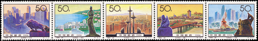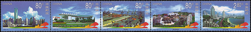 深圳位于我國(guó)南部地區(qū),擁有海洋的地理優(yōu)勢(shì),深圳是中國(guó)改革開(kāi)放后設(shè)立的第一個(gè)經(jīng)濟(jì)特區(qū),經(jīng)過(guò)20年的努力,昔日的邊陲小鎮(zhèn)現(xiàn)已發(fā)展成為一個(gè)經(jīng)濟(jì)繁榮,社會(huì)全面進(jìn)步的現(xiàn)代化國(guó)際大都市。郵票中可以看出現(xiàn)代化的高樓大廈,活動(dòng)中心等建筑物,整個(gè)城市現(xiàn)代感十足,被譽(yù)為中國(guó)改革開(kāi)放的窗口。該套郵票由于萬(wàn)新、張雪峰設(shè)計(jì),于2000年8月26日發(fā)行。