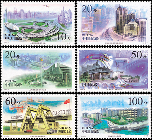 浦東緊靠上海市區(qū),位于黃浦江東側(cè),長(zhǎng)江口西南,川揚(yáng)河以北。1990年國(guó)務(wù)院制訂了開(kāi)發(fā)浦東,把上海建設(shè)成國(guó)際航運(yùn)中心,國(guó)際經(jīng)濟(jì)、金融、貿(mào)易中心之一的宏偉計(jì)劃。如今浦東新區(qū)建設(shè)已取得了巨大成就。該套郵票由李斌、楊順泰、張安樸設(shè)計(jì),1996年9月21日發(fā)行。