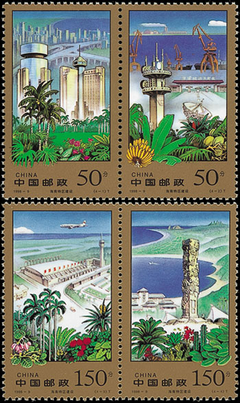 經(jīng)濟(jì)特區(qū)是在對(duì)外經(jīng)濟(jì)活動(dòng)中,采取更為開(kāi)放的政策,以吸引外國(guó)投資,繁榮本地區(qū)經(jīng)濟(jì)的一些城市與地區(qū)。這套郵票上的經(jīng)濟(jì)特區(qū)分別是深圳、珠海、汕頭、廈門(mén)、海南。這些經(jīng)濟(jì)特區(qū)的設(shè)立為我國(guó)的改革開(kāi)放闖開(kāi)了一條新路。該套郵票由王振華、陳曉聰設(shè)計(jì),于1994年12月10日發(fā)行。