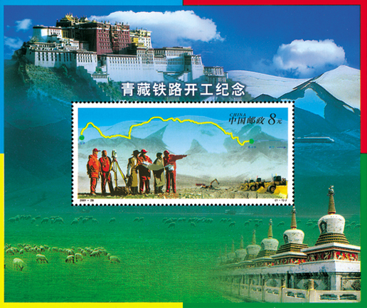 2001年12月29日,為紀(jì)念青藏鐵路(格爾木至拉薩)開(kāi)工,中國(guó)郵政發(fā)行了《青藏鐵路開(kāi)工紀(jì)念》紀(jì)念郵票小型張1枚。小型張主圖為漢藏技術(shù)人員在勘察地形和青藏鐵路示意圖;邊飾左上方為西藏布達(dá)拉宮,右上方是火車(chē)行駛在唐古拉山,左下方和中間為草原的羊群,右下方是青海塔爾寺;四角邊框分別為藍(lán)、紅、黃、綠色。該小型張由閻炳武、楊文清設(shè)計(jì)。
