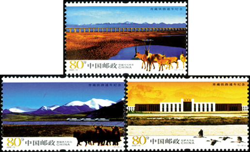 2006年7月1日,為紀(jì)念青藏鐵路全線(xiàn)建成通車(chē),中國(guó)郵政發(fā)行了《青藏鐵路通車(chē)紀(jì)念》紀(jì)念郵票1套3枚。第一枚為“穿越可可西里”,畫(huà)面主圖展現(xiàn)了青藏鐵路穿越可可西里自然保護(hù)區(qū)中水平如鏡的碧池、廣袤無(wú)垠的草原和遠(yuǎn)處平鋪高原湖泊時(shí)的壯觀(guān)景象。畫(huà)面右下角為一群藏羚在閑庭信步。第二枚為“翻越唐古拉山”,畫(huà)面主圖展現(xiàn)了在連綿的雪山映襯下,三個(gè)巨大的火車(chē)頭牽拉著長(zhǎng)長(zhǎng)的列車(chē)猶如一條鋼鐵巨龍翻越唐古拉山時(shí)的景象。畫(huà)面右下角為一群野牦牛在奔跑企望。第三枚為“拉薩火車(chē)站”。畫(huà)面主圖展現(xiàn)了在雄偉的布達(dá)拉宮映襯下的拉薩火車(chē)站主站房。畫(huà)面右下角為一行黑頸鶴在輕輕掠過(guò)。該套郵票由方軍設(shè)計(jì)。