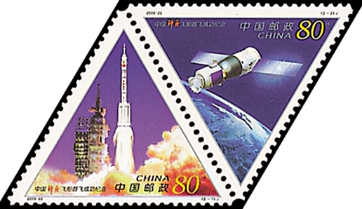 2000年11月20日,為了紀(jì)念我國(guó)第一艘載人航天飛船“神舟”號(hào)成功發(fā)射一周年,中國(guó)郵政發(fā)行了《中國(guó)“神舟”飛船首飛成功紀(jì)念》紀(jì)念郵票1套2枚。第一枚為“火箭騰飛”,畫(huà)面描繪了長(zhǎng)征二號(hào)F捆綁式火箭搭載“神舟”號(hào)試驗(yàn)飛船點(diǎn)火升空的精彩瞬間。第二枚為“飛船遨游”,畫(huà)面描繪了“神舟”號(hào)試驗(yàn)飛船在太空中遨游的身姿。本套郵票呈等邊三角形,其3個(gè)角頂點(diǎn)各有一個(gè)大圓形齒孔。該套郵票由王虎鳴、任國(guó)恩設(shè)計(jì)。