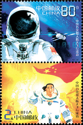 2003年10月16日,為紀(jì)念我國(guó)首次載人航天飛行成功,中國(guó)郵政特別發(fā)行了《中國(guó)首次載人航天飛行成功》紀(jì)念郵票1套2枚。第一枚為“英姿”,畫(huà)面主圖為身著宇航服的航天員形象,背景為“神舟”五號(hào)載人飛船翱翔太空的靚影和深邃浩淼的太空。第二枚為“凱旋”,畫(huà)面主圖為身著宇航服的航天員走出返回艙敬禮時(shí)的形象,背景由國(guó)旗、長(zhǎng)城、宇航員、返回艙和飛船運(yùn)行軌跡組成。該套郵票由王虎鳴、劉向平設(shè)汁。