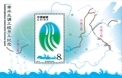 南水北調(diào)工程屬于發(fā)展中國(guó)經(jīng)濟(jì)的里程碑式工程。我國(guó)南北水資源的分布極為不均,南方氣候濕潤(rùn),水資源充足,而北方卻干燥干旱,黃土高原便是一個(gè)明顯的例子,然而我國(guó)大量重工業(yè)卻在北方,因此開(kāi)啟南水北調(diào)工程,將長(zhǎng)江水引入黃河各分支,可達(dá)到協(xié)調(diào)水資源的效果。為了紀(jì)念工程開(kāi)工,中國(guó)郵政發(fā)行《南水北調(diào)工程開(kāi)工紀(jì)念》郵票小型張1枚,由陳楠設(shè)計(jì),于2003年9月26日發(fā)行。