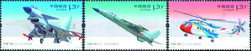 2011年4月17日,新中國(guó)航空工業(yè)創(chuàng)建60周年之際,中國(guó)郵政發(fā)行《中國(guó)飛機(jī)(二)》特種郵票1套3枚,郵票內(nèi)容分別為“殲-10殲擊機(jī)”、“飛豹?dú)灀艮Z炸機(jī)”、“AC313直升機(jī)”。該套郵票由方軍、孟慶晨設(shè)計(jì)。