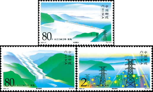 長(zhǎng)江三峽地處三角地帶,地勢(shì)險(xiǎn)峻,水流湍急。2003年,我國(guó)為了經(jīng)濟(jì)發(fā)展的需要,決定開(kāi)啟長(zhǎng)江三峽工程,利用水能進(jìn)行發(fā)電,這套特種郵票便架構(gòu)了水庫(kù)蓄水 、船閘通航、 電站發(fā)電這3個(gè)過(guò)程,表達(dá)了對(duì)三峽發(fā)電的美好愿景。該套郵票由陳楠設(shè)計(jì),2003年8月20日發(fā)行。