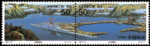 1997年11月8日,為紀(jì)念長(zhǎng)江三峽工程大江截流成功,郵電部發(fā)行了《長(zhǎng)江三峽工程·截流》特種郵票1套2枚。第一枚為“明渠通航”,圖案為位于長(zhǎng)江三峽工程中堡島右側(cè)的導(dǎo)流明渠,該渠既是二期施工期唯一的泄水河道,也是該時(shí)期中枯水季的重要航運(yùn)通道。第二枚為“大江截流”,圖案為位于長(zhǎng)江三峽工程中堡島左側(cè)的大江截流主體。該套郵票以連票形式展示了明渠通航和大江截流的壯觀(guān)場(chǎng)景,由徐勇民、王涌、劉壽祥、宋克靜設(shè)計(jì)。