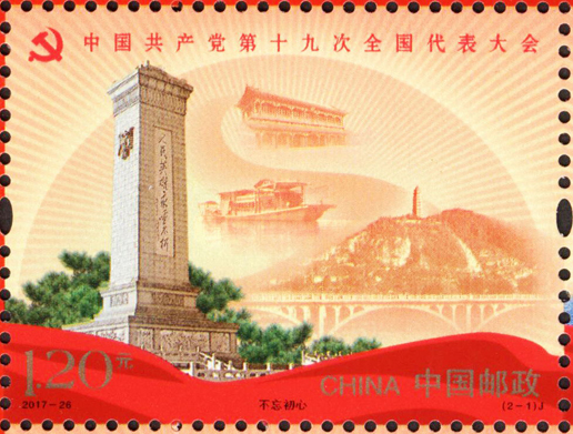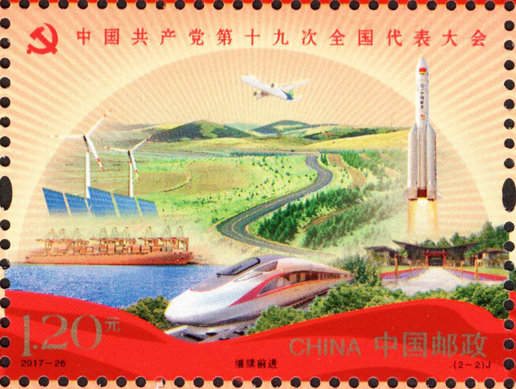 中國(guó)共產(chǎn)黨第十九次全國(guó)代表大會(huì)于2017年10月18日至10月24日在北京召開(kāi)。這次大會(huì)的主題是:不忘初心,牢記使命,高舉中國(guó)特色社會(huì)主義偉大旗幟,決勝全面建成小康社會(huì),奪取新時(shí)代中國(guó)特色社會(huì)主義偉大勝利,為實(shí)現(xiàn)中華民族偉大復(fù)興的中國(guó)夢(mèng)不懈奮斗。黨的十九大,是在全面建成小康社會(huì)決勝階段、中國(guó)特色社會(huì)主義發(fā)展關(guān)鍵時(shí)期召開(kāi)的一次十分重要的大會(huì)。承擔(dān)著謀劃決勝全面建成小康社會(huì)、深入推進(jìn)社會(huì)主義現(xiàn)代化建設(shè)的重大任務(wù),事關(guān)黨和國(guó)家事業(yè)繼往開(kāi)來(lái),事關(guān)中國(guó)特色社會(huì)主義前途命運(yùn),事關(guān)最廣大人民根本利益。為紀(jì)念中國(guó)共產(chǎn)黨第十九次全國(guó)代表大會(huì)的召開(kāi),中國(guó)郵政發(fā)行紀(jì)念郵票一套2枚,小型張1枚。郵票圖案內(nèi)容分別為:不忘初心、繼續(xù)前進(jìn),小型張內(nèi)容為筑夢(mèng)。該套郵票由馬立航設(shè)計(jì),于2017年10月18日發(fā)行。