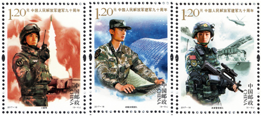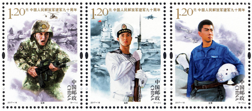 2017年8月1日,中國(guó)郵政發(fā)行《中國(guó)人民解放軍建軍九十周年》紀(jì)念郵票一套6枚,小型張1枚。圖案內(nèi)容分別為:陸軍、海軍、空軍、火箭軍、戰(zhàn)略支援部隊(duì)、武裝警察部隊(duì),小型張內(nèi)容為聽(tīng)黨指揮。該套郵票展現(xiàn)了中國(guó)人民解放軍的颯爽英姿和中國(guó)軍事作戰(zhàn)裝備的硬件實(shí)力,主題鮮明,磅礴大氣,畫(huà)面具有強(qiáng)烈的動(dòng)感和威嚴(yán)的氣勢(shì)。小型張上軍旗飄揚(yáng),各軍種英姿颯爽,背景襯托各軍種高尖端裝備,描繪了我軍戰(zhàn)士聯(lián)合作戰(zhàn)的畫(huà)面,既表現(xiàn)了中國(guó)人民解放軍威武雄壯的軍容和現(xiàn)代化水平,也表現(xiàn)了在黨的指揮下,人民軍隊(duì)忠實(shí)履行保衛(wèi)祖國(guó)、捍衛(wèi)和平的神圣使命。該套郵票的設(shè)計(jì)者為李翔、李晨、倉(cāng)亭亭、劉偉、沈璐。