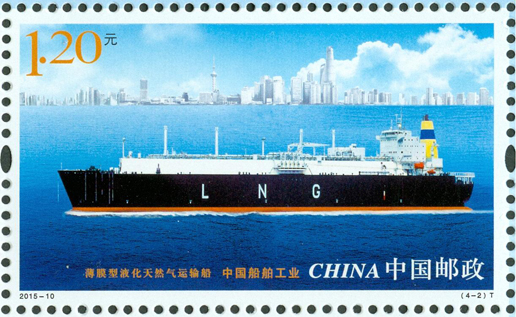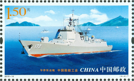 2015年6月3日,中國(guó)郵政發(fā)行《中國(guó)船舶工業(yè)》特種郵票1套4枚,內(nèi)容分別為航天測(cè)量船、薄膜型液化天然氣運(yùn)輸船、海上浮式生產(chǎn)儲(chǔ)油船、導(dǎo)彈驅(qū)逐艦。該套郵票遴選了代表我國(guó)造船先進(jìn)水平的、不同類(lèi)型的船舶,以橫向陳列的方式展示了船舶優(yōu)美的形態(tài)和龐大的規(guī)模。畫(huà)面氣氛的營(yíng)造不僅突出船舶工作的環(huán)境,還強(qiáng)調(diào)船舶在現(xiàn)代化建設(shè)中所承擔(dān)的功能。郵票畫(huà)面整體布局均衡、協(xié)調(diào),層次清晰,空間感強(qiáng)。該套郵票由史淵設(shè)計(jì)。