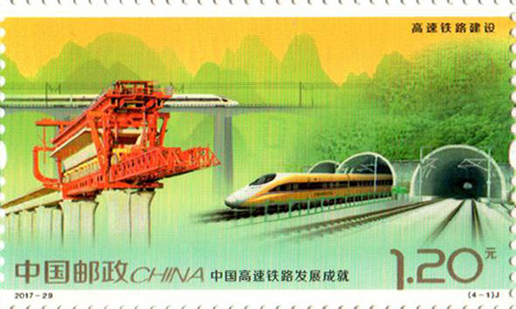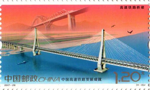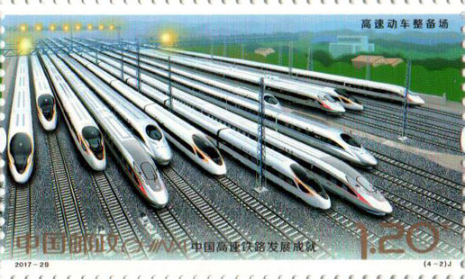 2017年11月25日,中國(guó)郵政發(fā)行《中國(guó)高速鐵路發(fā)展成就》紀(jì)念郵票1套4枚,小型張1枚。圖案內(nèi)容分別為:高速鐵路建設(shè)、高速動(dòng)車(chē)整備場(chǎng)、 高速鐵路橋梁、高速鐵路客站,小型張內(nèi)容為“復(fù)興號(hào)”動(dòng)車(chē)組。該套郵票設(shè)計(jì)者為沈嘉宏,小型張?jiān)O(shè)計(jì)者為尚盈。