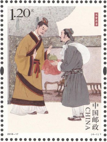 中國(guó)五千年的文明史中,剛正不阿、廉潔自律的仁人志士,留下了許多膾炙人口的廉政故事,在華夏文化中已成經(jīng)典。中國(guó)郵政于2018年6月24日發(fā)行《清正廉潔(一)》特種郵票1套4枚,郵票圖案名稱(chēng)分別為:不貪為寶、羊續(xù)懸魚(yú)、兩袖清風(fēng)和立檄拒禮。該套郵票由胡博綜設(shè)計(jì),郵票以中國(guó)傳統(tǒng)繪畫(huà)的藝術(shù)形式,生動(dòng)還原了四個(gè)典故的歷史場(chǎng)景。