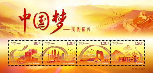 2014年9月20日,中國(guó)郵政發(fā)行《中國(guó)夢(mèng)—民族振興》特種郵票一套4枚,小全張1枚。郵票內(nèi)容分別為政治文明、經(jīng)濟(jì)發(fā)展、文化繁榮、民族團(tuán)結(jié)。該套郵票由何潔、周岳、陳楠設(shè)計(jì)。