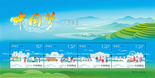 2015年7月25日,為深入揭示“中國(guó)夢(mèng)”的本質(zhì)內(nèi)涵,進(jìn)一步弘揚(yáng)中國(guó)精神,凝聚中國(guó)力量,中國(guó)郵政發(fā)行了《中國(guó)夢(mèng)—人民幸?!诽胤N郵票一套4枚。郵票內(nèi)容分別為安居樂(lè)業(yè)、社會(huì)保障、社會(huì)和諧、美好生活。該套郵票畫(huà)面以藍(lán)天為背景,通過(guò)一幅幅插畫(huà)描繪出一派和諧祥和的場(chǎng)景,營(yíng)造出一幅人民幸福的美好愿景,藝術(shù)地反映了“中國(guó)夢(mèng)—人民幸?!钡闹黝}。該套郵票由何潔、周岳設(shè)計(jì)。