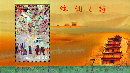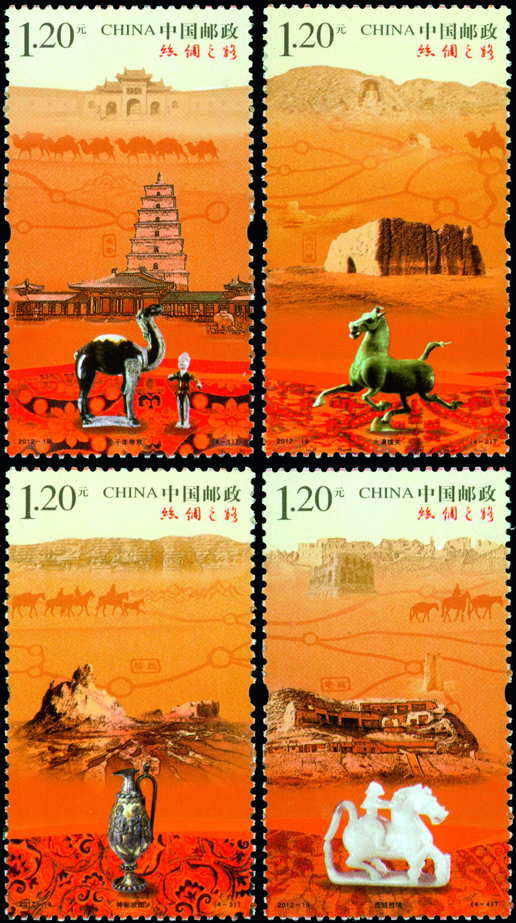 2012年8月1日,中國(guó)郵政發(fā)行《絲綢之路》特種郵票一套4枚,小型張1枚。郵票內(nèi)容分別為千年帝京、大漠雄關(guān)、神秘故國(guó)、西域勝境,小型張內(nèi)容為交流。該套郵票由陳景異、惠斌、李群設(shè)汁。