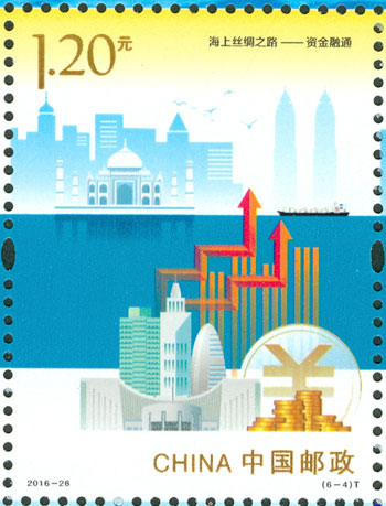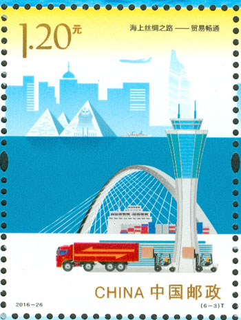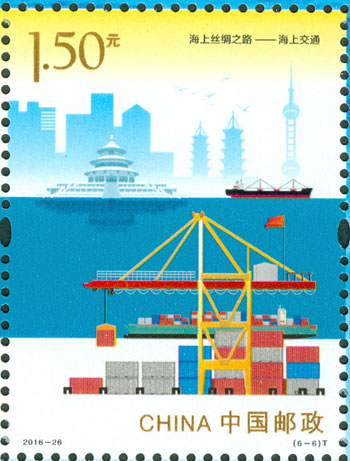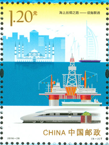 2016年9月10日,中國(guó)郵政發(fā)行《海上絲綢之路》特種郵票一套6枚,小全張1枚,郵票內(nèi)容分別為:政策溝通、設(shè)施聯(lián)通、貿(mào)易暢通、資金融通、民心相通、海上交通。該套郵票采用六枚聯(lián)票形式設(shè)計(jì),以畫(huà)面中部的海平面進(jìn)行串聯(lián),將畫(huà)面分割為前景主題與背景。小全張邊飾以海洋為背景。晨光初現(xiàn),燈塔指引的燈光尚未熄滅,一輪紅日由海平面冉冉升起,喻示著21世紀(jì)海上絲綢之路的嶄新開(kāi)始與光明前景。該套郵票由何潔、周岳設(shè)計(jì)。