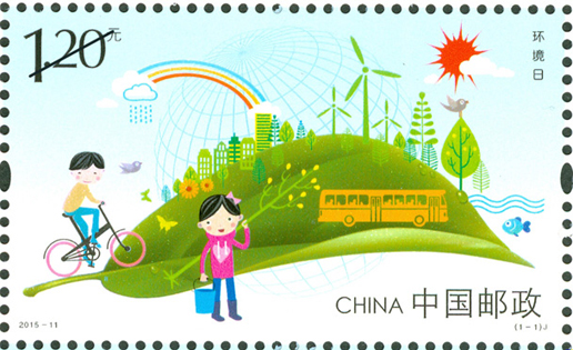 2015年6月5日是新修訂的《中華人民共和國(guó)環(huán)境保護(hù)法》實(shí)施后的首個(gè)“環(huán)境日”。中國(guó)郵政發(fā)行《環(huán)境日》紀(jì)念郵票1套1枚,郵票采用卡通漫畫(huà)的形式,描繪了一幅綠色生態(tài)、環(huán)保宜居的生活環(huán)境,以郵票為媒介倡導(dǎo)社會(huì)可持續(xù)發(fā)展的生活方式,鼓勵(lì)和支持新能源的開(kāi)發(fā)利用,傳遞積極向上、健康的生活態(tài)度。該套郵票由李志宏設(shè)計(jì)。