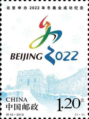 2015年7月31日,北京成功獲得2022年第24屆冬奧會(huì)舉辦權(quán),舉國(guó)上下一片沸騰。為紀(jì)念北京這次申辦冬奧會(huì)成功,中國(guó)郵政于31日晚上特別發(fā)行一枚《北京申辦2022年冬奧會(huì)成功紀(jì)念》郵票。郵票設(shè)計(jì)突出表現(xiàn)了北京申辦2022年冬奧會(huì)的標(biāo)志,同時(shí)輔以白雪覆蓋的長(zhǎng)城為襯托,帶給人們冬季白雪茫茫的視覺(jué)感受。該套郵票由夏競(jìng)秋設(shè)計(jì)。