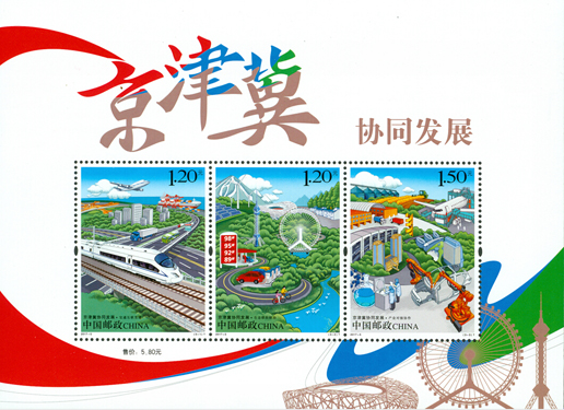 2017年3月9日,中國(guó)郵政發(fā)行《京津冀協(xié)同發(fā)展》特種郵票一套3枚,圖案內(nèi)容分別為:交通互聯(lián)互通、生態(tài)聯(lián)防聯(lián)治、產(chǎn)業(yè)對(duì)接協(xié)作。該套郵票以交通、生態(tài)、產(chǎn)業(yè)的“三個(gè)突破”為表現(xiàn)內(nèi)容,著力體現(xiàn)京津冀協(xié)同發(fā)展戰(zhàn)略中先行啟動(dòng)的領(lǐng)域。該套郵票由鄒慶設(shè)計(jì)。