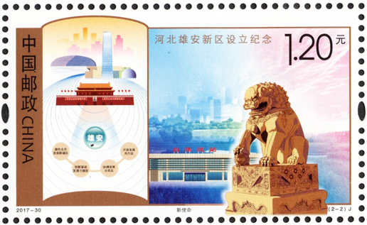 2017年12月22日,中國(guó)郵政發(fā)行《河北雄安新區(qū)設(shè)立紀(jì)念》紀(jì)念郵票1套2枚。圖案內(nèi)容分別為:新起點(diǎn)、新使命。該套郵票猶如徐徐展開(kāi)的畫(huà)卷,昭示著在以習(xí)近平同志為核心的黨中央堅(jiān)強(qiáng)領(lǐng)導(dǎo)下,雄安新區(qū)發(fā)展的美好前景。該套郵票設(shè)計(jì)者為武世寧。
