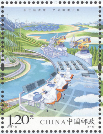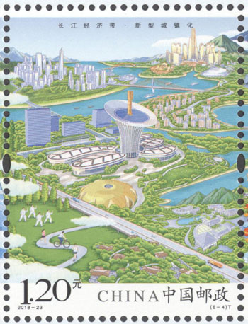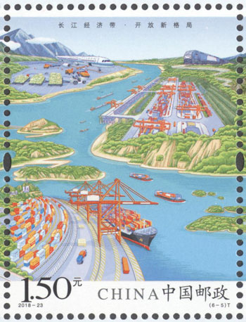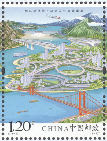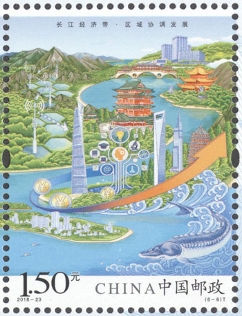 2018年8月26日,中國(guó)郵政發(fā)行《長(zhǎng)江經(jīng)濟(jì)帶》特種郵票1套6枚,小全張1枚。郵票圖案名稱(chēng)分別為:共抓大保護(hù)、綜合立體交通走廊、產(chǎn)業(yè)轉(zhuǎn)型升級(jí)、新型城鎮(zhèn)化、開(kāi)放新格局、區(qū)域協(xié)調(diào)發(fā)展。郵票以手繪方式生動(dòng)展示了長(zhǎng)江經(jīng)濟(jì)帶全方位的發(fā)展成就。第一圖描繪了長(zhǎng)江經(jīng)濟(jì)帶共抓大保護(hù)的發(fā)展理念和美麗的自然生態(tài)。第二圖展現(xiàn)了長(zhǎng)江經(jīng)濟(jì)帶科學(xué)高效的綜合立體交通走廊。第三圖展示了長(zhǎng)江經(jīng)濟(jì)帶產(chǎn)業(yè)轉(zhuǎn)型升級(jí),加速培育新動(dòng)能。第四圖描繪了長(zhǎng)江經(jīng)濟(jì)帶以人為本的新型城鎮(zhèn)化。第五圖展現(xiàn)了長(zhǎng)江經(jīng)濟(jì)帶的開(kāi)放新格局。第六圖描繪了長(zhǎng)江經(jīng)濟(jì)帶的區(qū)域協(xié)調(diào)發(fā)展。郵票設(shè)計(jì)者為鄒慶。