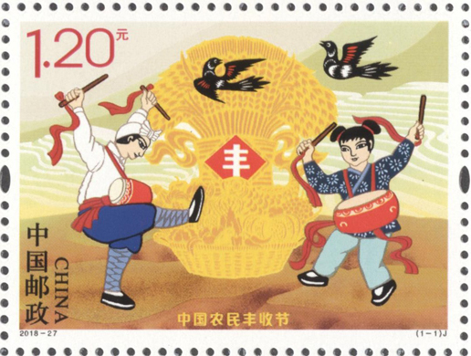 經(jīng)黨中央批準(zhǔn)、國(guó)務(wù)院批復(fù),自2018年起,將每年農(nóng)歷秋分設(shè)立為“中國(guó)農(nóng)民豐收節(jié)”。第一屆“中國(guó)農(nóng)民豐收節(jié)”的日期為2018年9月23日(農(nóng)歷戊戌年八月十四)。中國(guó)郵政當(dāng)天發(fā)行《中國(guó)農(nóng)民豐收節(jié)》紀(jì)念郵票1套1枚,郵票表現(xiàn)了農(nóng)民在金秋時(shí)節(jié)慶祝豐收的場(chǎng)景,表現(xiàn)了一幅全國(guó)上下“慶五谷豐登、享豐收喜悅”的美好畫(huà)面。郵票設(shè)計(jì)者為沈嘉宏。