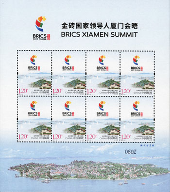 金磚國(guó)家領(lǐng)導(dǎo)人第九次會(huì)晤于2017年9月3日至5日在中國(guó)福建省廈門(mén)市舉辦。中國(guó)郵政于2017年8月19日發(fā)行《金磚國(guó)家領(lǐng)導(dǎo)人廈門(mén)會(huì)晤》紀(jì)念郵票一套1枚。該套郵票以2017金磚國(guó)家領(lǐng)導(dǎo)人廈門(mén)會(huì)晤標(biāo)識(shí)為主要設(shè)計(jì)元素,結(jié)合了鼓浪嶼、廈門(mén)大學(xué)、集美學(xué)村等最具廈門(mén)特點(diǎn)的風(fēng)光和人文標(biāo)志,整幅畫(huà)面視野開(kāi)闊,色調(diào)雅致。該套郵票由汪濤設(shè)計(jì)。