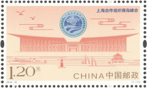 上海合作組織成員國(guó)元首理事會(huì)第十八次會(huì)議于2018年6月9日至10日在山東省青島市舉行,中國(guó)郵政于2018年6月9日發(fā)行《上海合作組織青島峰會(huì)》紀(jì)念郵票1套1枚。郵票以上海合作組織會(huì)徽及主場(chǎng)館——青島國(guó)際會(huì)議中心線(xiàn)描圖為主要元素,以祥云、海鷗為裝飾;畫(huà)面下方以線(xiàn)描手法,表現(xiàn)海上棧橋、帆船、燈塔、輪船等景物,展現(xiàn)了會(huì)議舉辦地——黃海明珠青島的特色,整體設(shè)計(jì)簡(jiǎn)潔明快,主題突出。該套郵票由于秋艷、邢文偉設(shè)計(jì)。