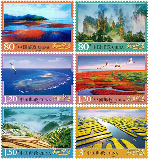 中國(guó)郵政于2013年5月19日發(fā)行《美麗中國(guó)》普通郵票第一組,一套6枚,郵票展現(xiàn)了我國(guó)六處風(fēng)情各異的美麗景觀(guān):霞浦灘涂、張家界天子山、三沙七連嶼、盤(pán)錦紅海灘、龍勝梯田、興化垛田。該套郵票由馬立航、姜偉杰設(shè)計(jì)。