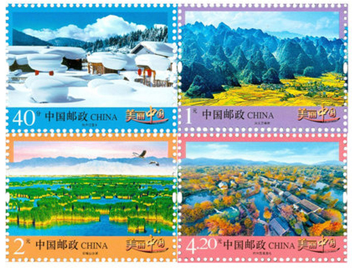 中國(guó)郵政于2016年5月12日發(fā)行《美麗中國(guó)》(二)普通郵票一套4枚,圖案內(nèi)容分別為: 牡丹江雪鄉(xiāng)、興義萬(wàn)峰林、石嘴山沙湖、杭州西溪濕地?!睹利愔袊?guó)》普通郵票第二組延續(xù)了第一組的設(shè)計(jì)風(fēng)格,選取我國(guó)東南西北各地風(fēng)光,其地貌差別大,風(fēng)景多樣,方寸之上展示了我國(guó)的幅員遼闊,山川秀美。該套郵票由馬立航設(shè)計(jì)。