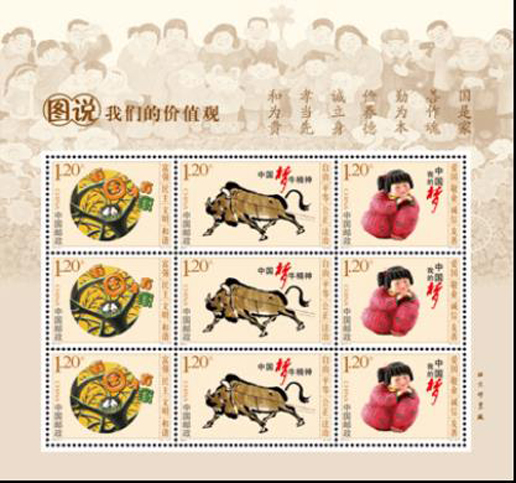2015年11月29日,中國(guó)郵政發(fā)行《圖說(shuō)我們的價(jià)值觀(guān)》特種郵票一套3枚。郵票內(nèi)容選取了“鳥(niǎo)巢”“牛精神”“夢(mèng)娃”三個(gè)畫(huà)面,文化形式豐富多彩,內(nèi)容積極向上,形象地宣傳和闡述了社會(huì)主義核心價(jià)值觀(guān)。該套郵票由夏競(jìng)秋設(shè)計(jì)。